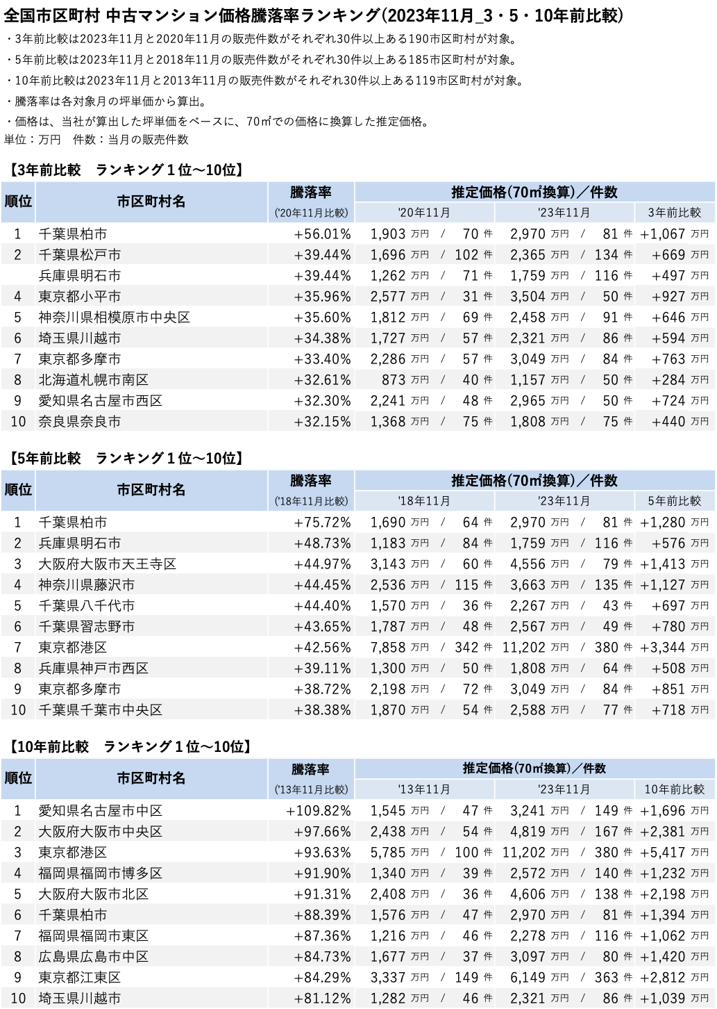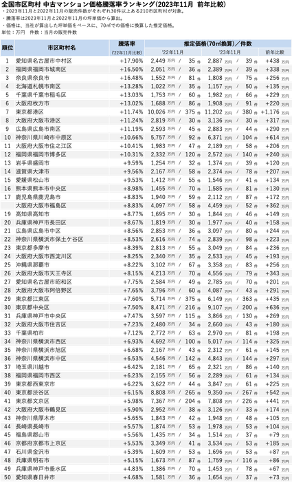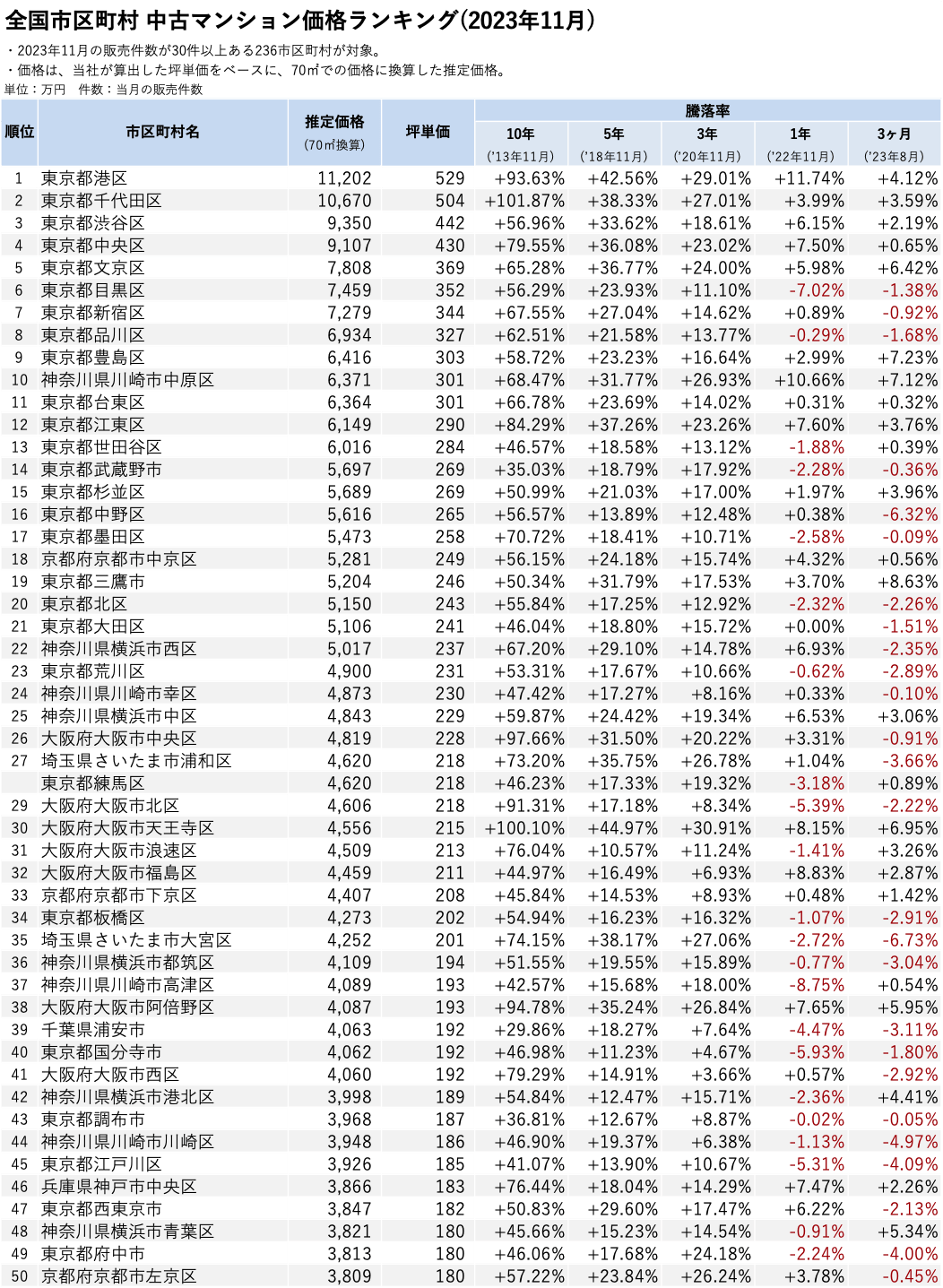 「マンションレビュー」2023年11月 全国市区町村 中古マンション価格/騰落率ランキング100を発表