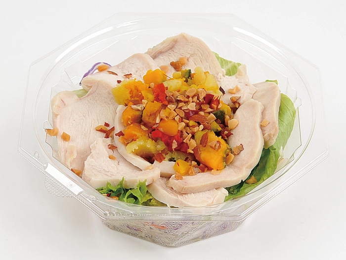 たっぷりの葉野菜に、四角くカットしたかぼちゃやさつまいも等秋の味覚と、ジューシーでやわらかいチキンフィレをトッピングしました。