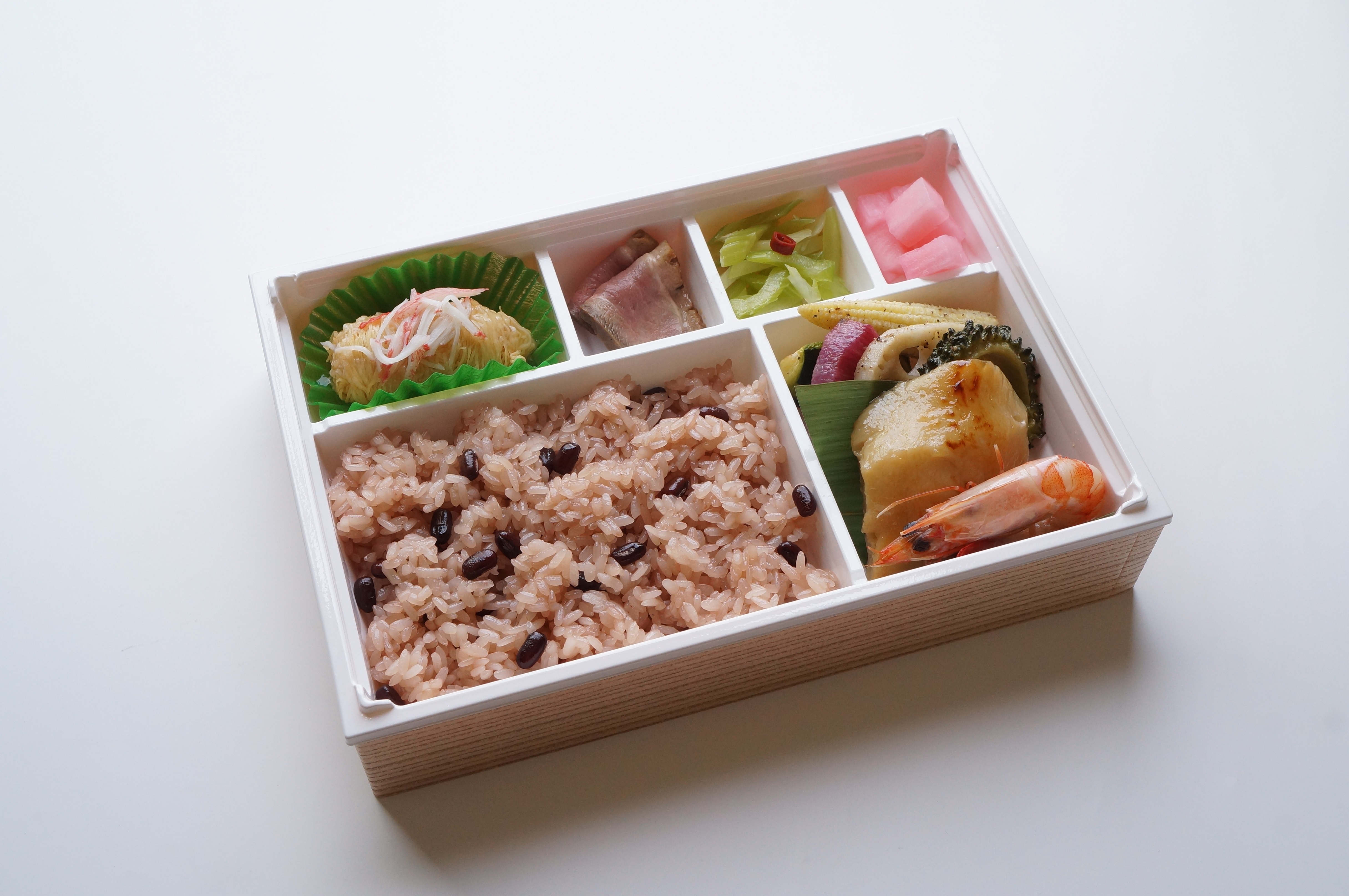 懐石料理人が丹精込めて炊きあげた赤飯に、カラス鰈の西京焼き、海老の旨煮、合鴨山椒煮など幾重自信作の惣菜や副菜を盛り合わせました。