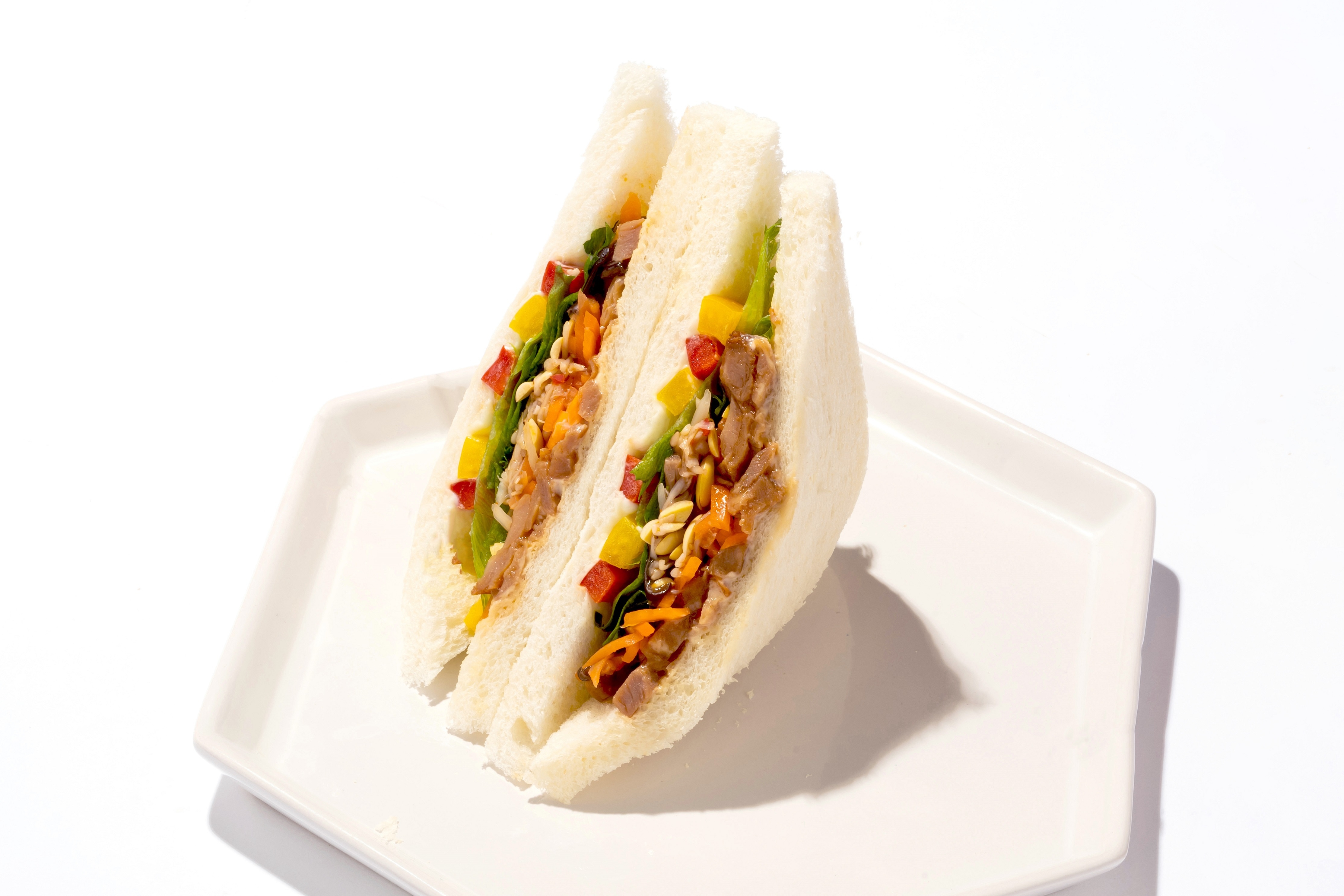 彩り豊かで甘い焼肉風サンド。照焼ソースに漬けたチキンにビビンバ・キャロットラペをのせプルコギソースをかけ、赤と黄色のパプリカを添えました。