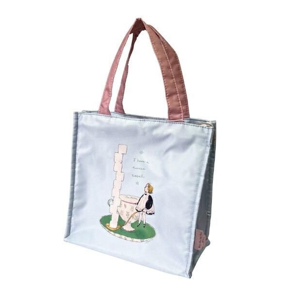 淡いブルーの本体に、くすみピンクの持ち手が映えるオシャレで可愛らしいバッグ。