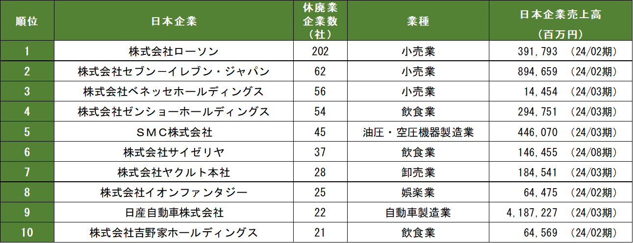 上位10社は小売業・飲食業がそれぞれ3社ずつを占め、休廃業しやすい傾向が見られます。これらの業種はチェーン展開を行う企業が多く、消費者の嗜好や流行に左右されやすい特徴があります。エリアの衰退や消費者の移動に伴う店舗の閉鎖や移転が頻繁に発生し、それらが登記上の休廃業件数増加の一因となっています。