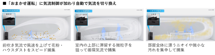 また、室内の空気中に浮遊する花粉やハウスダスト、PM2.5などの粒子の大きさを高感度センサーで判別し、大きさに合わせて気流を自動的に制御する風向自動を併用した「おまかせ運転」や、用途に合わせて選べる「パワフル花粉」「浮遊飛沫」モードも新たに搭載しています。