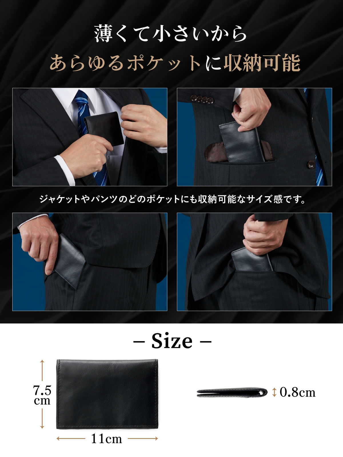 ・縦7.5cm × 横11cmのミニマムサイズで、ジャケットや財布、ズボンのポケットにもスッと収まる。