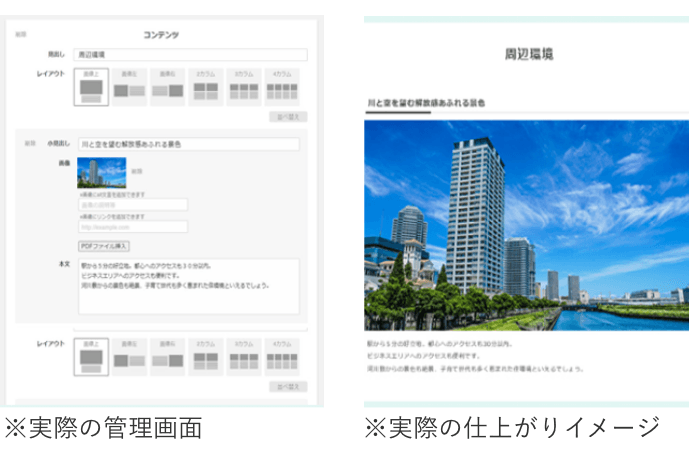 デザインテンプレートが用意してあり、管理画面から物件の写真や概要、周辺エリアの情報を入力するだけで特設サイトが完成。