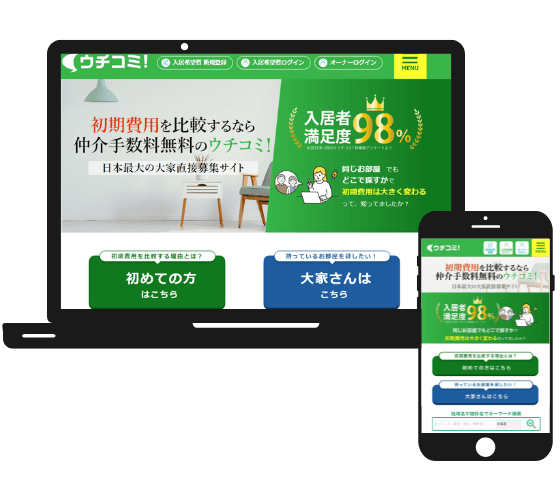 一方「ウチコミ!」は、大家さんが直接物件を掲載するため、全ての物件に仲介手数料0円で引っ越しできる仕組みとなります。