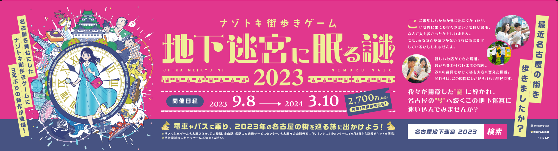 リアル脱出ゲームを主催、企画制作する株式会社 SCRAP(所在地:東京都渋谷区、代表者:加藤隆生)は、東海テレビ放送(所在地:愛知県名古屋市、代表者:小島 浩資)および名古屋市交通局(所在地:愛知県名古屋市)は、3社共催にて開催するナゾトキ街歩きゲーム『地下迷宮に眠る謎2023』の開催を記念して、本日2023年9月1日(金)から10月31日(火)までの期間限定で、謎を掲出した名古屋市営地下鉄東山線の特別列車の運行決定を発表いたします。