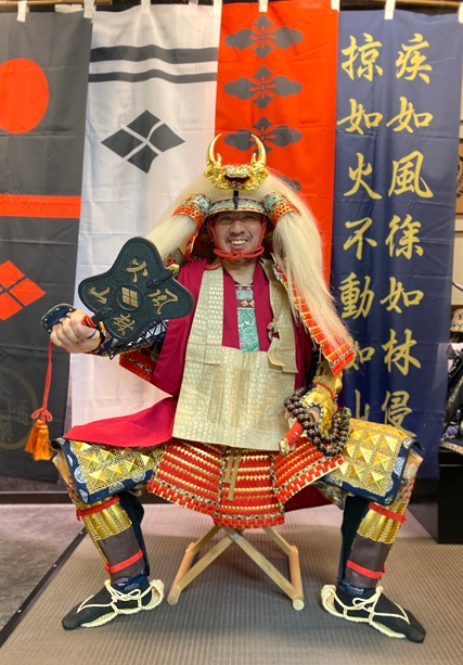 スタジオ内には、武田・上杉それぞれの軍旗も掲げ、雰囲気をさらに演出。戦国ファンにとってはたまらない撮影体験です。