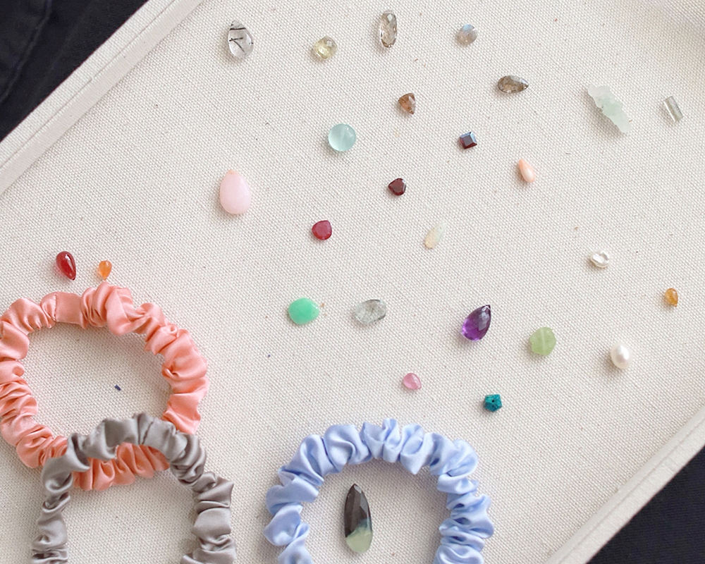 細いシルクサテンのシュシュにjaaiの天然石が揺れる『おまもりシュシュ』。