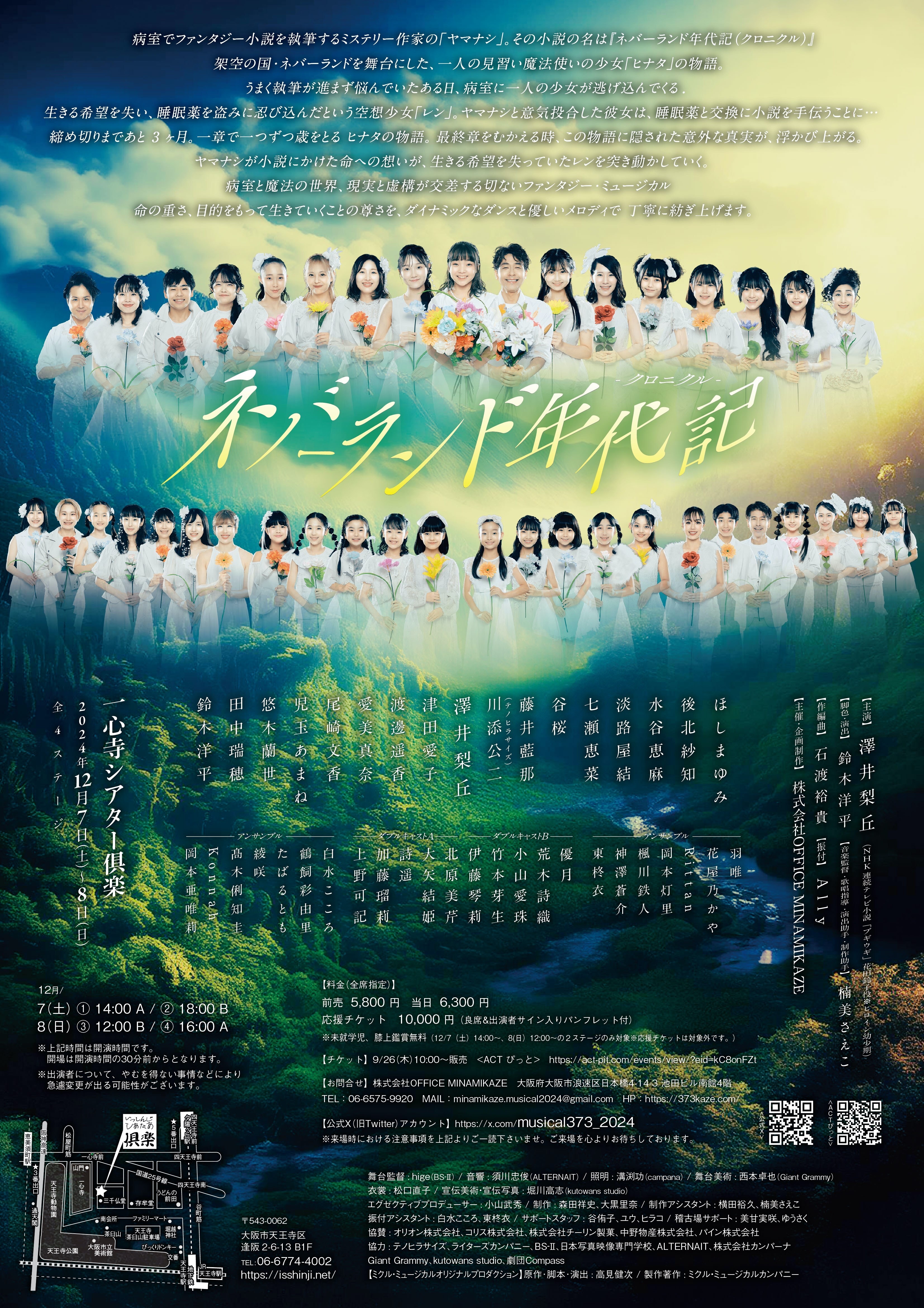 2023年度後期NHK連続テレビ小説「ブギウギ」ヒロイン幼少期(花田鈴子役)を演じた澤井梨丘が初ミュージカル・主演となるOFFICE MINAMIKAZEプロデュースミュージカル公演「ネバーランド年代記 -クロニクル-」を2024年12月7日(土)8日(日)一心寺シアター倶楽(大阪市天王寺区)にて開催いたします。