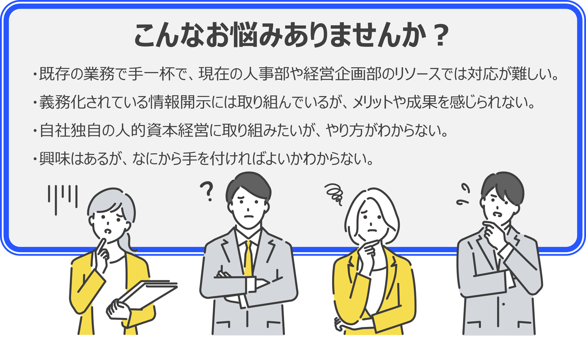 2023年3月期に、有価証券報告書に人的資本項目の開示が義務付けられ、人的資本経営を推進する潮流が企業経営に影響を及ぼしています。ジョブ型雇用への制度改正や自律的キャリア形成など、新しい形のマネジメントが求められ、皆様の企業でも、議論や検討が進んでいるのではないでしょうか。そのような背景のなか、社内リソースに課題がある、情報開示の効果が感じられない、などお悩みの方も多くいらっしゃいます。