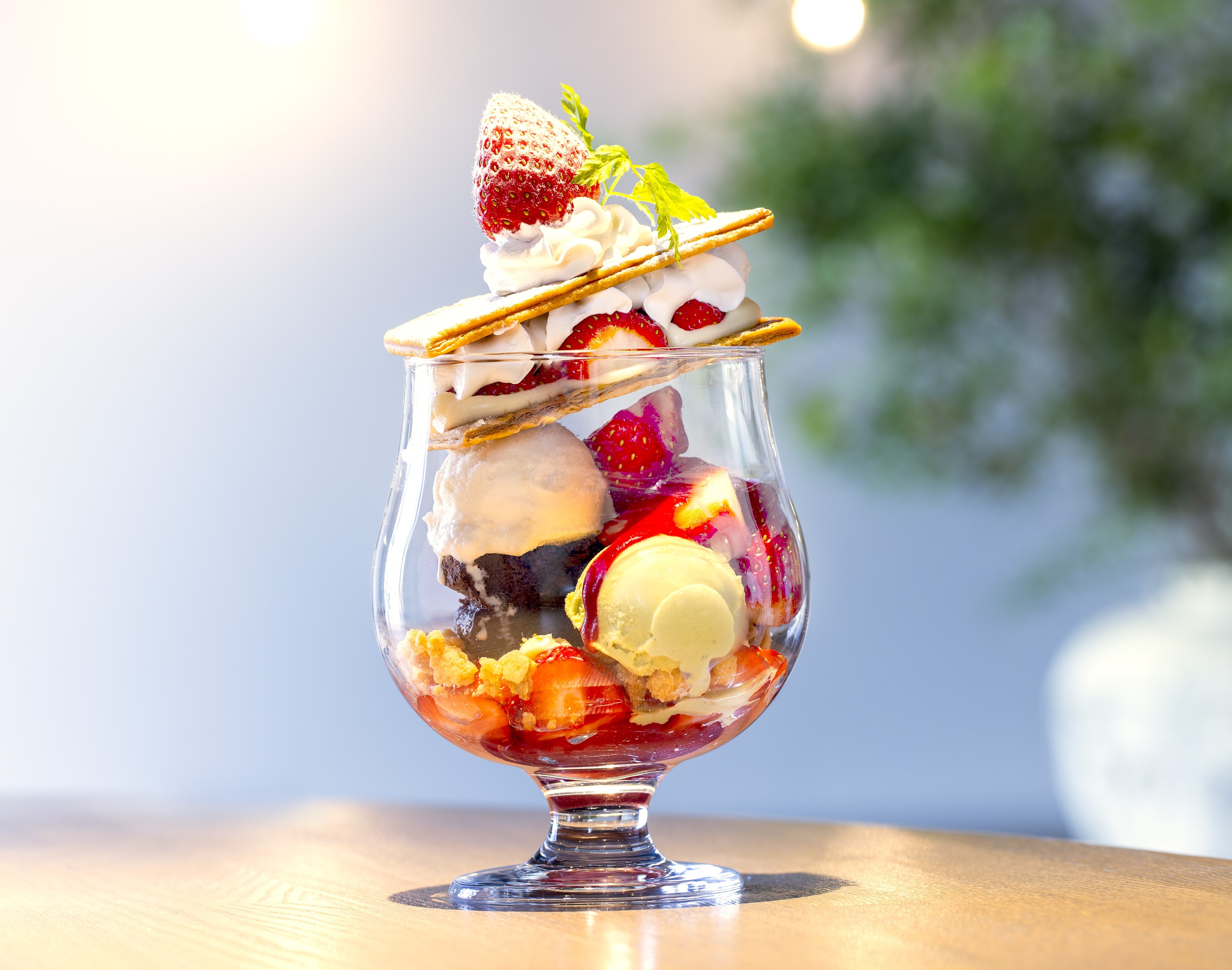 和歌山県のオリジナルいちご品種「まりひめ」を使用したミルフィーユなどが味わえるフルーツパーラーならではのパフェ