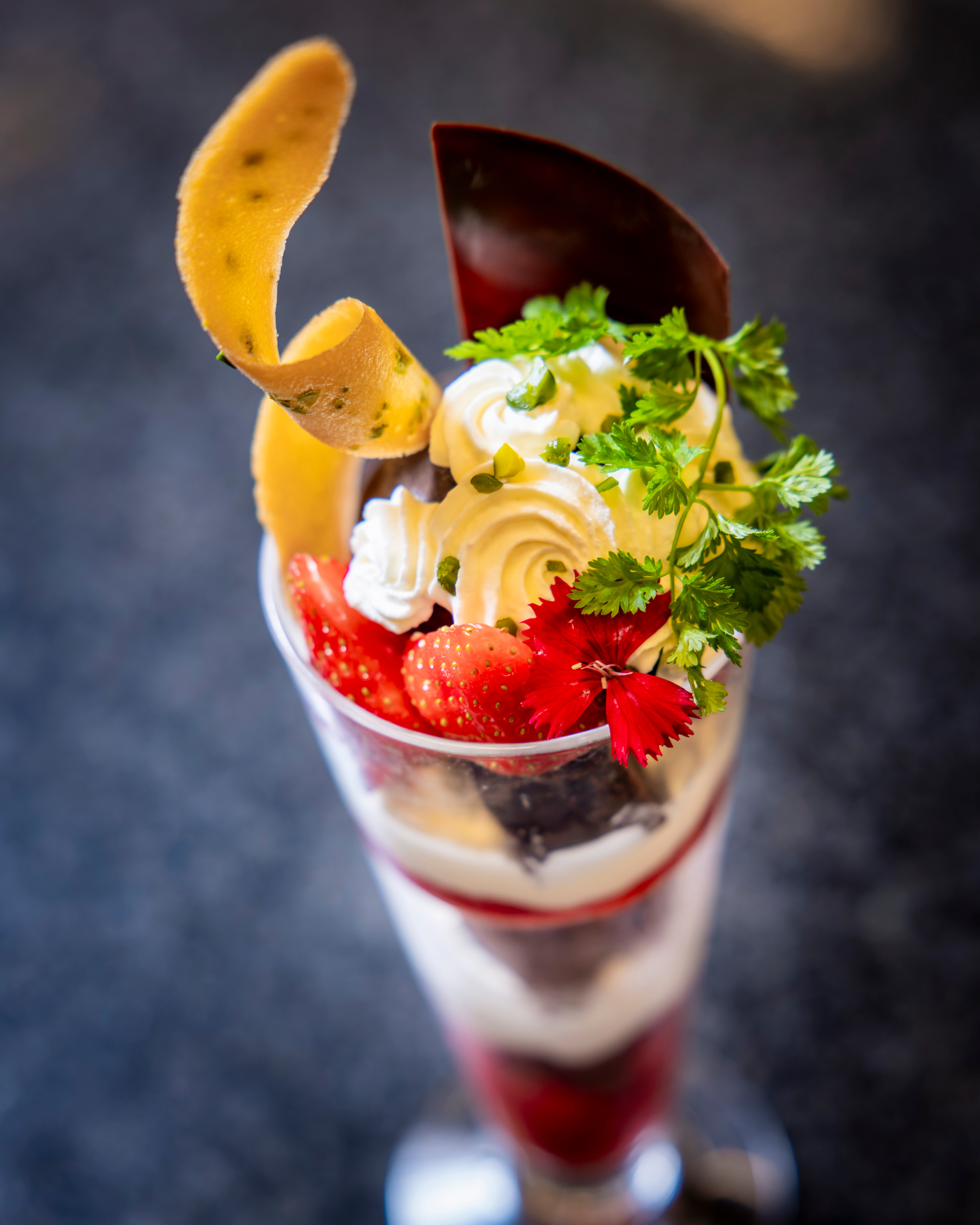 シルスマリアの生チョコレートとベリー系フルーツのマリアージュ。濃厚なのにさっぱり仕上げたパフェ