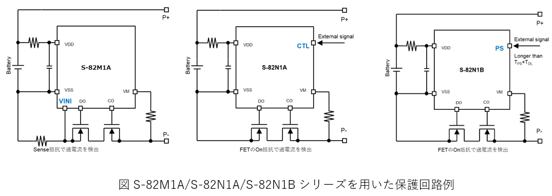 - 外付けの電流検出抵抗により、高精度な過電流保護を実現(S-82M1Aシリーズ)