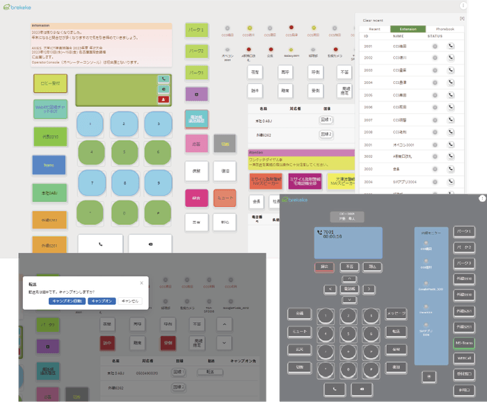 株式会社日本ブレケケ(本社:埼玉県川越市、代表取締役:山出 晋)は、多機能電話機をWEBブラウザ上で再現するWebRTC電話機『オペレーターコンソール』を2023年12月12日より提供開始します。これまでPBXメーカーの専用機で提供されてきた、キャンプオン、シェアードラインキーといった多機能電話特有の機能をWEBアプリ上に再現し、更に各機能ボタンの色、配置、追加、削除を自由にデザインできるため、利用シーンに合わせたオリジナル電話機の作成が可能となりました。