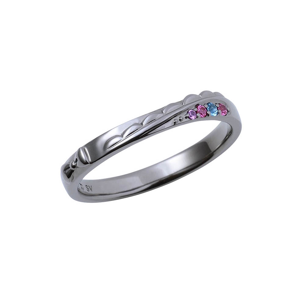 4石のカラーストーンをセット。側面のリボンがポイントです。内側には名前刻印を施しました。