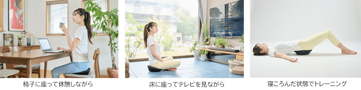 空気で膨らませる一般的なバランスボールに比べて省スペースで、ダイニングチェアやオフィスチェアなど椅子を選ばずどんな座面にも置いて使用できます。座って骨盤を動かすことで仕事中やTVを見ながら、簡単にストレッチができ、「ながら運動」の習慣作りも期待できます。