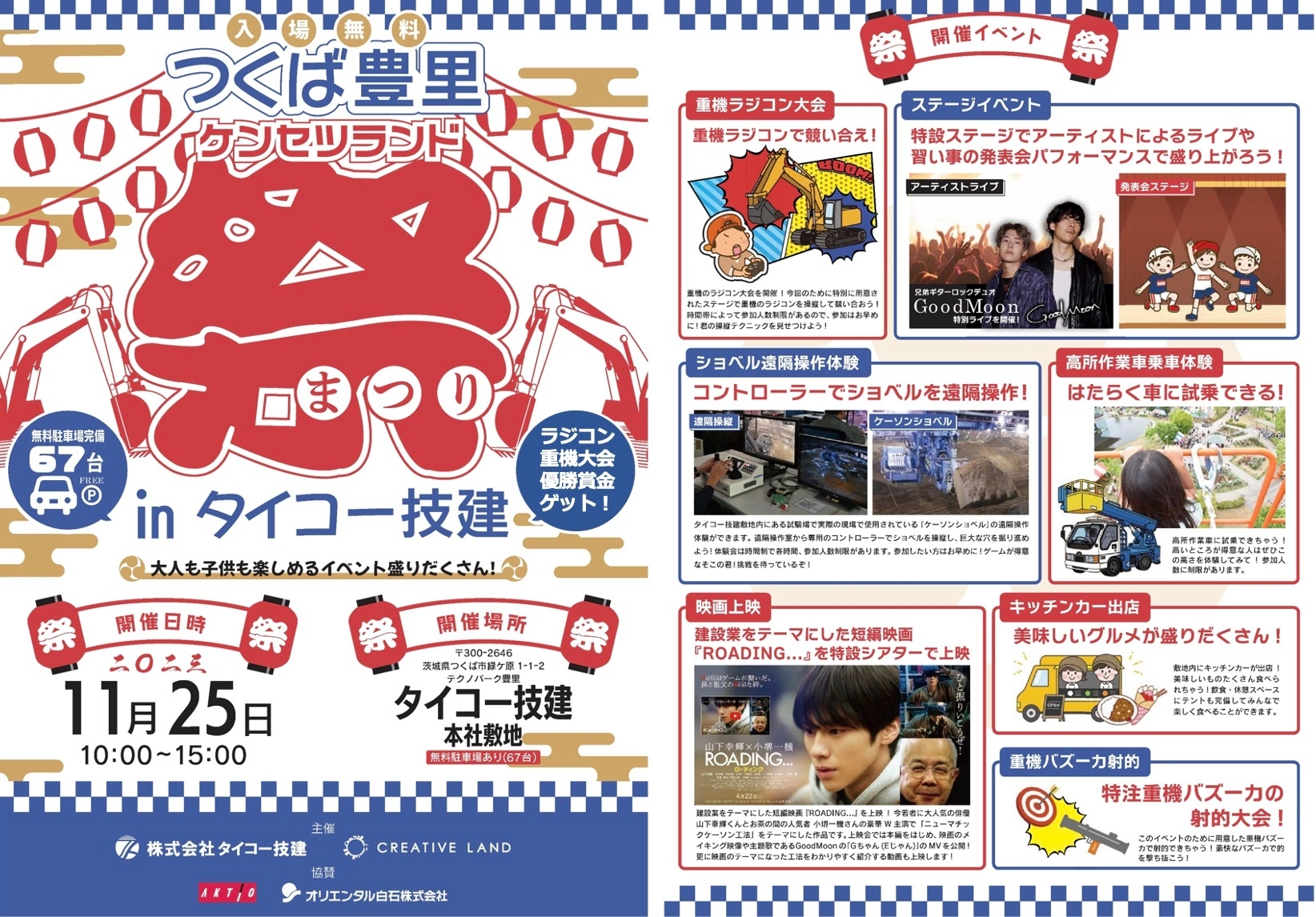 エンタメ、カルチャー、サービス、テクノロジーと建設を掛け合わせることで建設業界のリブランディングに挑戦している株式会社クリエイティブ・ラボ(本社:東京都江東区豊洲、代表取締役:岩本 靖、以下「クリエイティブ・ラボ」)は、“エンタメ”を通じて、建設に興味の無い一般の方々に建設に興味を持ってもらうことを目的に、茨城県つくば市の地元建設会社「株式会社タイコー技建」の工場を利用して、地元の方々に楽しんで参加いただけるイベント「つくば豊里ケンセツランド祭」を2023年11月25日(土)に開催いたします(入場無料、無料駐車場67台完備)。