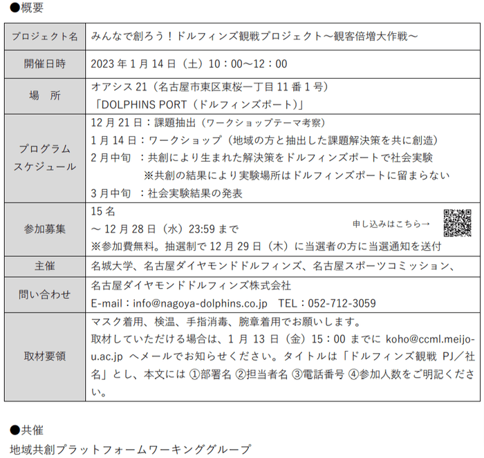 ドルフィンズをもっと広めたい熱いファン、将来プロスポーツクラブと関わる仕事をしたい、まちづくりに貢献したいと熱い志を持つ学生など、多くの参加を呼び掛けています。ぜひ、ご取材ください。