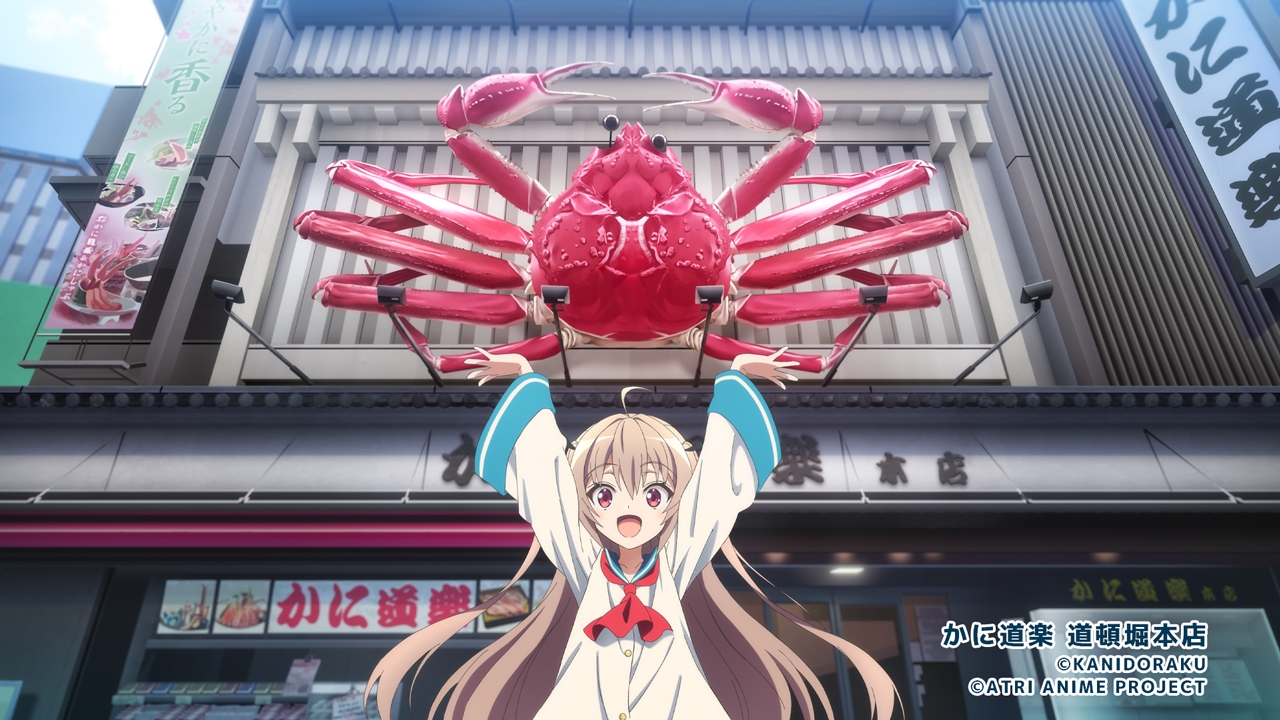 また第6話のエンドカードが公開になりました。今回はなんと「かに道楽 道頓堀本店」!作品内でカニが大好きなアトリ。カニを捕まえたり食べたりと大好物のカニ繋がりにて、今回かに料理の専門店である「かに道楽」とのコラボが決定しました。「かに道楽」は、大阪の道頓堀で1960年に創業。以来、かに料理一筋で現在に至っており、かに料理に対する美味しさへの探求心は今もなお受け継がれています。今回はその道頓堀本店を背に、目印である巨大なカニの看板と一緒にポーズするアトリのイラストが、スタジオTROYCAによる描き下ろしにて実現しました。
