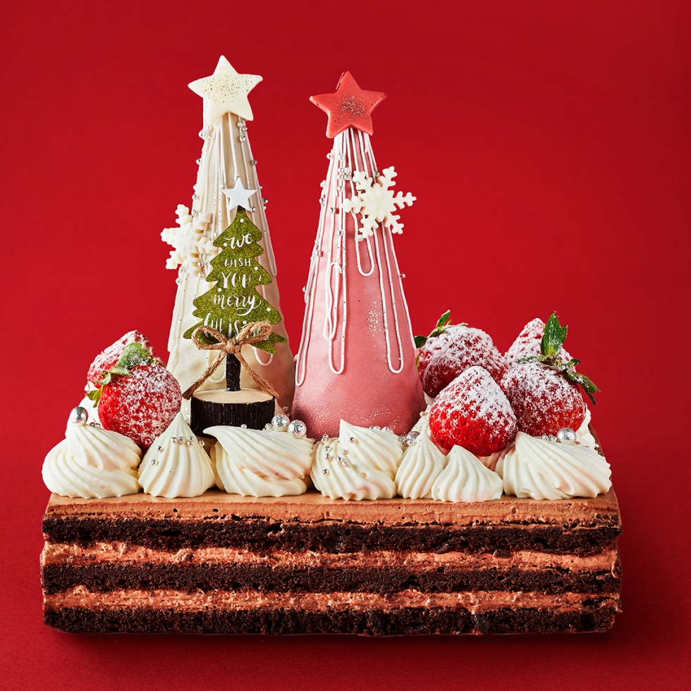 箱を開けたら思わず歓声があがりそうな特別感のあるクリスマスケーキ。ふんわり食感のスポンジと口どけのよい生クリーム、厳選された苺を使用したショートケーキを土台に、チョコレートケーキにピスタチオクリームを絞ったツリーをのせました。仕上げに可愛らしい真っ赤なリボンをデコレーションした、ショートケーキ、チョコレートケーキ、ピスタチオクリームの3つの味が楽しめるスペシャルなケーキです。一生に一度の今年のクリスマスが最高の思い出になりますように、パティシエが心をこめて作ります。