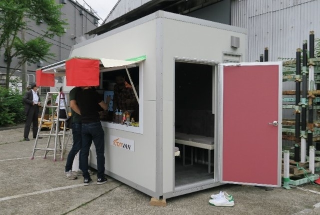 移動店舗は、店舗でありながらキッチンカー同様、「移動することができる」うえ、その構造の特性から、飲食店舗でありながら建築工事や内装工事が不要で、駐車場や空き地などに設置が可能。1BOX設置に、駐車場1台分のスペースで済むのが特徴です。
