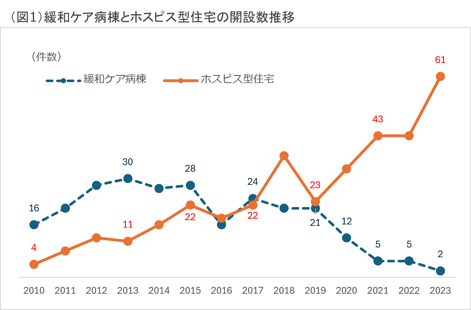 図1は緩和ケア病棟とホスピス型住宅の新設数推移である。緩和ケア病棟は2013年をピークに減少基調で推移。2021年以降は10ヶ所未満/年と低調が続く。一方、ホスピス型住宅は、年々新設数が増加。2020年以降では30ヶ所以上/年が開業しており、2023年は過去最大の61ヶ所となった。