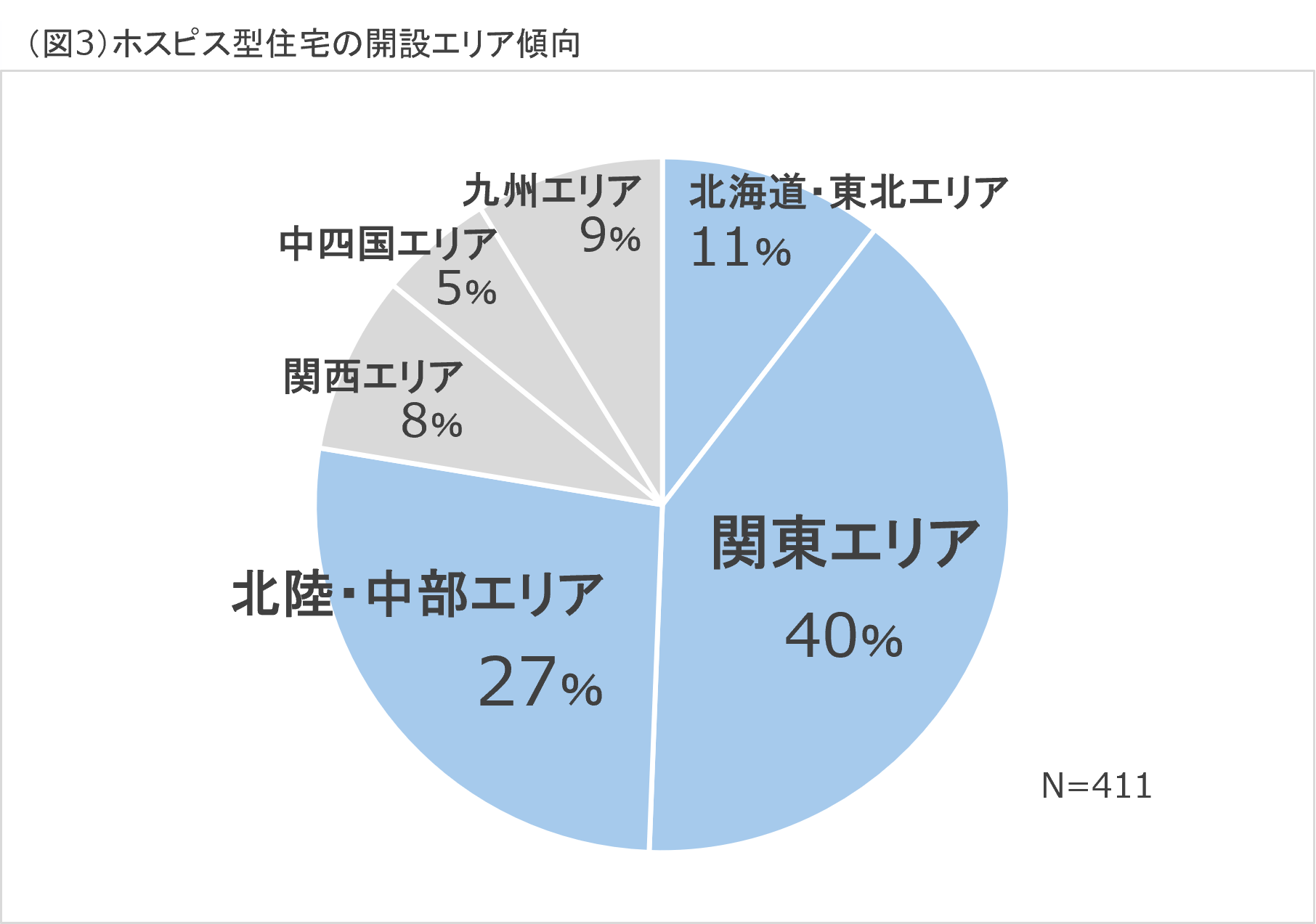 図3は、全国6エリアにおけるホスピス型住宅の開設地をエリアごとに分類したグラフである。関東エリアが40%と最も多く、次いで北陸・中部エリア、北海道・東北エリアが続く。