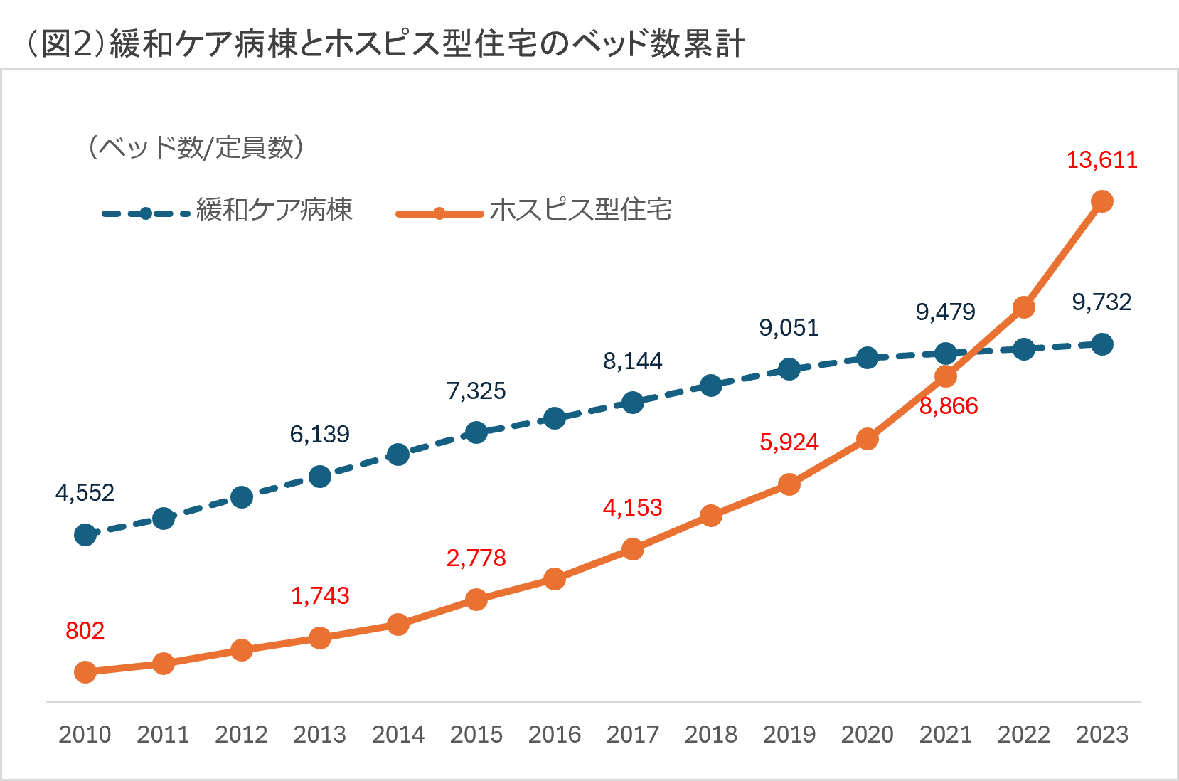 図2はそれぞれのベッド数/定員数の累計を示したグラフだが、2022年にホスピス型住宅の定員数が緩和ケア病棟のベッド数を上回った。