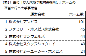 表1は主に「がん末期や難病患者向け」ホームの運営を行う事業者の運営ホーム数上位5社である。多くががん末期の患者を対象としたホスピス型住宅を運営し、近年急速に拠点数を増やしている。この内、株式会社サンウェルズはパーキンソン病患専門のホーム「PDハウス」を運営しており、他社とは運営コンセプトが異なる。