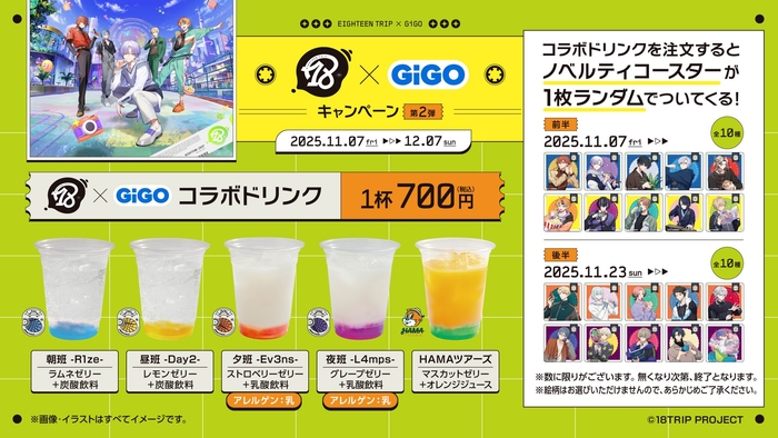 GiGOコラボカフェスタンドにて『18TRIP』の各班とHAMAツアーズをイメージしたコラボドリンクを販売いたします。