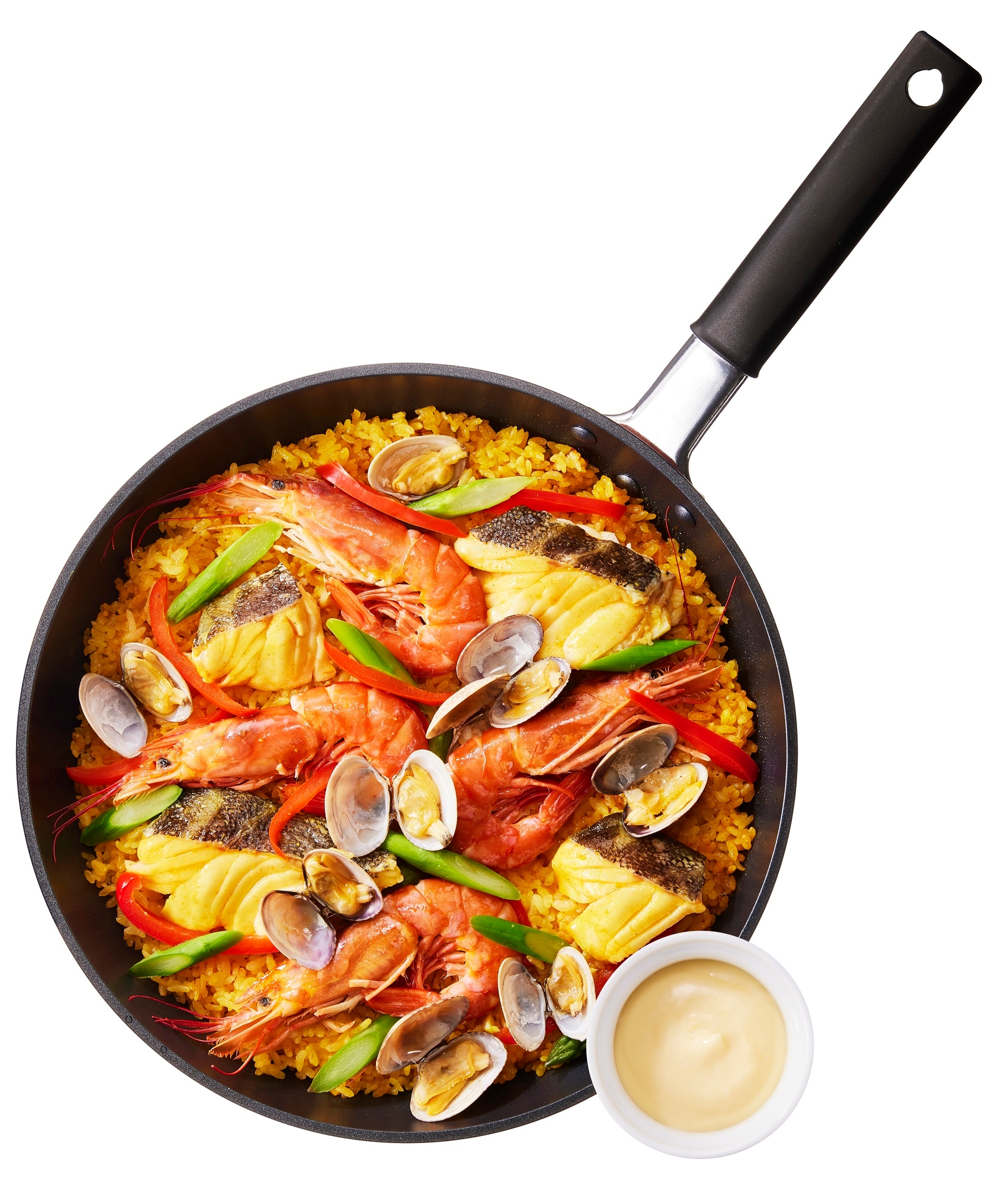 魚介の旨みがしみ込んだスペインの米料理、 レモン&ガーリック風味のマヨネーズソースで味変できる 『シーフードソムリエ監修 パエリアの素』8月1日発売