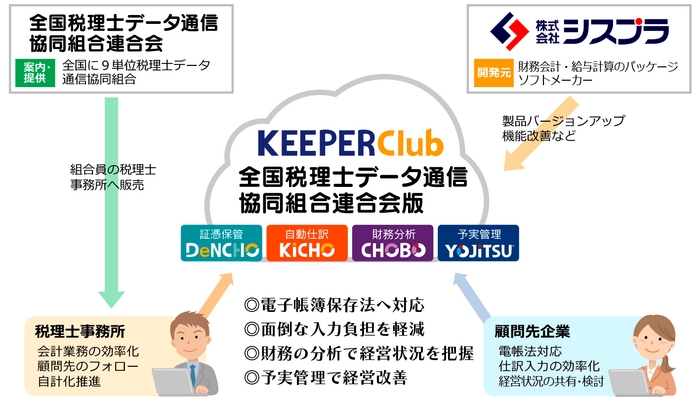 財務会計・給与計算パッケージソフトメーカーの株式会社シスプラ(本社所在地:群馬県高崎市、代表取締役社長:椛澤 均、以下 シスプラ)と全国税理士データ通信協同組合連合会(本社所在地:東京都渋谷区、会長:浅井 和夫、以下 全国データ)は本日10月1日、統合型クラウド財務管理システム「KEEPER Club 全国税理士データ通信協同組合連合会版(以下 KEEPER Club全国データ版)」をリリースいたしました。