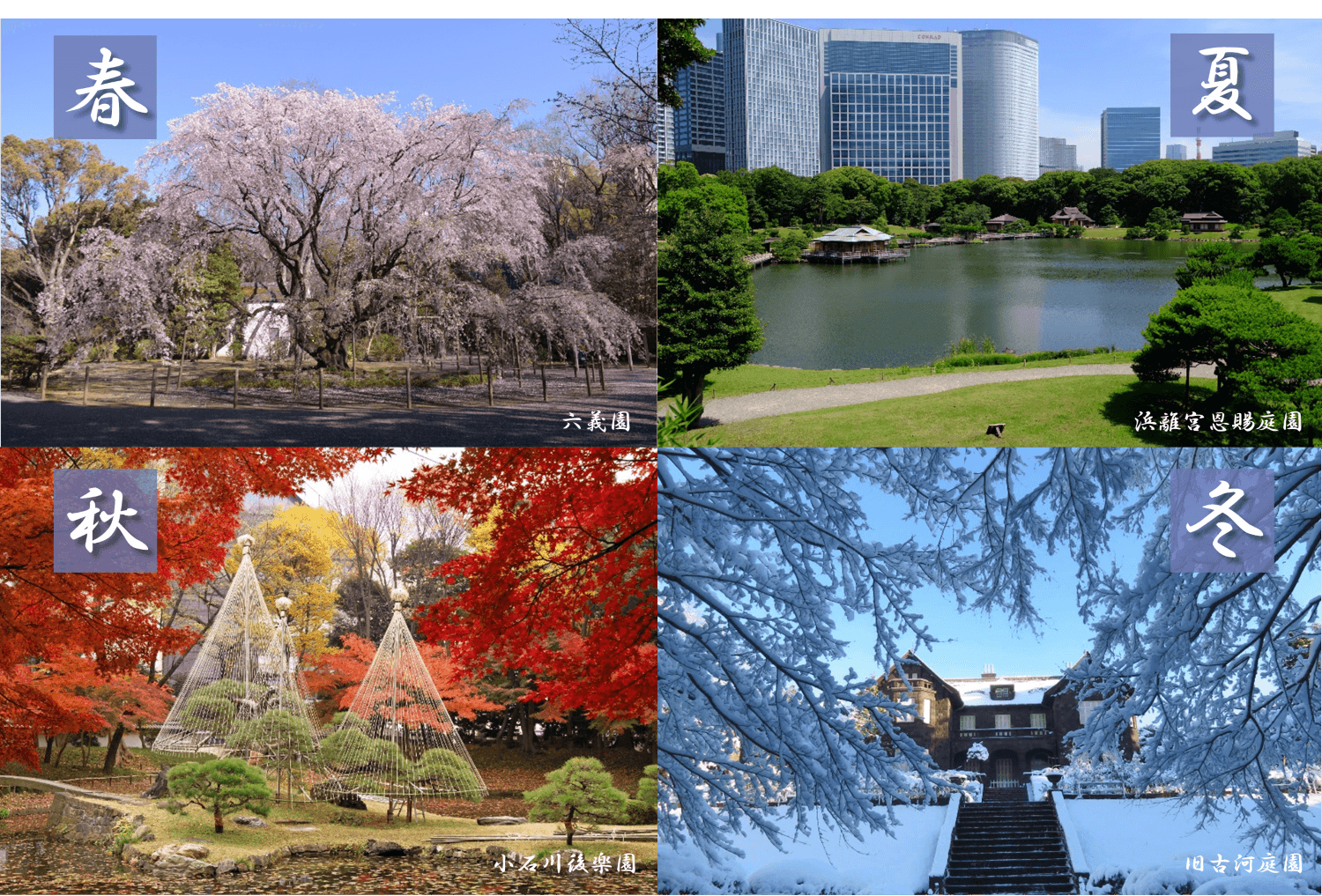 浜離宮恩賜庭園、旧芝離宮恩賜庭園、小石川後楽園、六義園、旧岩崎邸庭園、向島百花園、清澄庭園、旧古河庭園、殿ヶ谷戸庭園