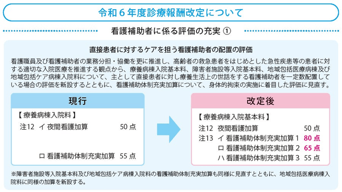 看護職員及び看護補助者の業務分担・協働を更に推進し、療養病棟入院基本料、障害者施設等入院基本料、地域包括医療病棟及び地域包括ケア病棟入院料について、主として直接患者に対し療養生活上の世話をする看護補助者を一定数配置している場合の評価が新設されました。