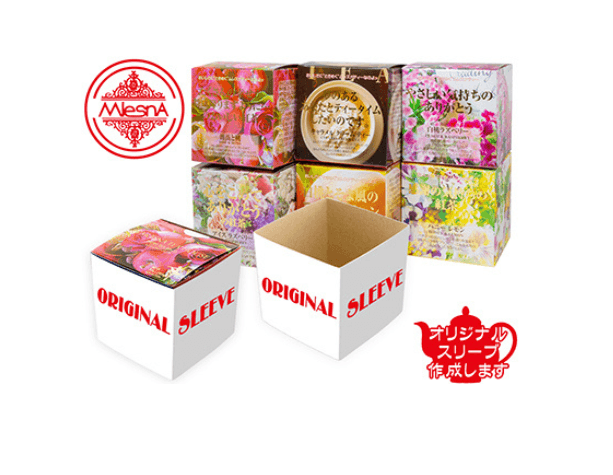 MLESNA TEA オリジナルCUBE BOXとは既存のパッケージに筒状のオリジナルスリーブケースをセットしたものです。印刷面は4面あり、全面フルカラー印刷が可能です。自社サービスの説明や感謝のメッセージなど、配布目的に応じたデザインをお入れいただけます。