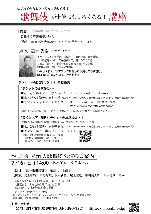 (公財)北区文化振興財団主催、『歌舞伎が十倍おもしろくなる!講座』が2023年6月25日 (日)に北とぴあつつじホール(東京都北区王子1-11-1)にて開催されます。チケットはカンフェティ(運営:ロングランプランニング株式会社、東京都新宿区、代表取締役:榑松 大剛)にて発売中です。