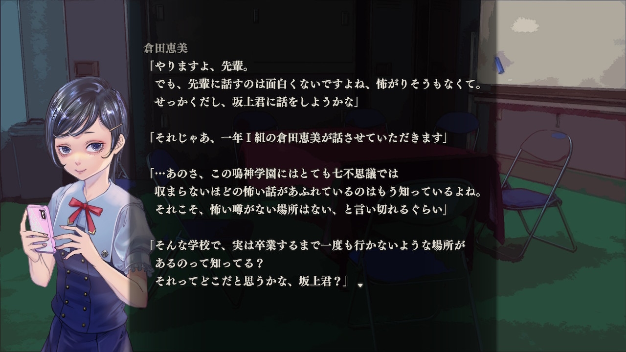 あなたは鳴神学園新聞部の新人坂上修一となり、学校新聞の怖い話の記事を書くために七不思議の集会を行います。