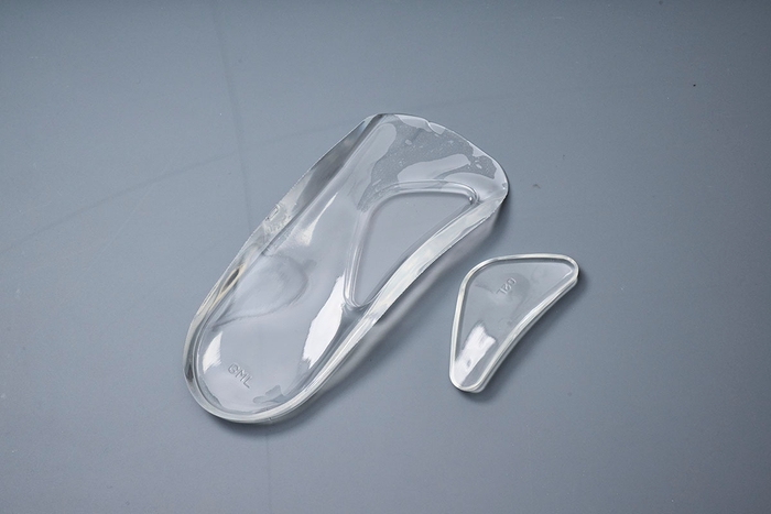(2)足圧分散:足裏の組織に近い硬さの医療用超柔軟ゲル『クリスタルゲル(R)』を使用しているので、metaインソールが足裏の一部のように密着することで足裏全体に足圧を分散します。