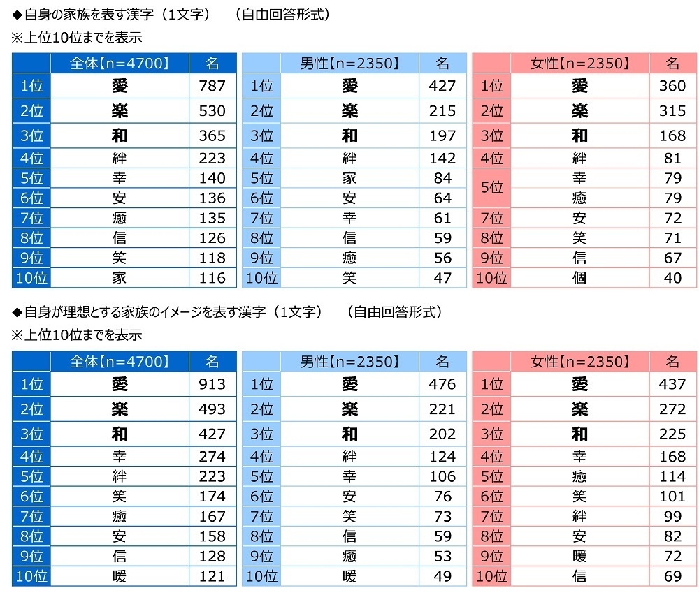 全回答者(4,700名)に、自身の家族を表す漢字(1文字)を聞いたところ、1位「愛」(787名)、2位「楽」(530名)、3位「和」(365名)、4位「絆」(223名)、5位「幸」(140名)となりました。自身の家族に対し、愛情や楽しさ、和やかさ、絆、幸せといった、ポジティブなイメージを持っている人が多いのではないでしょうか。また、10位圏外には、「賑」(25位)や「騒」(29位)、「忍」(31位)、「穏」(34位)、「変」(35位)といった漢字もみられました。