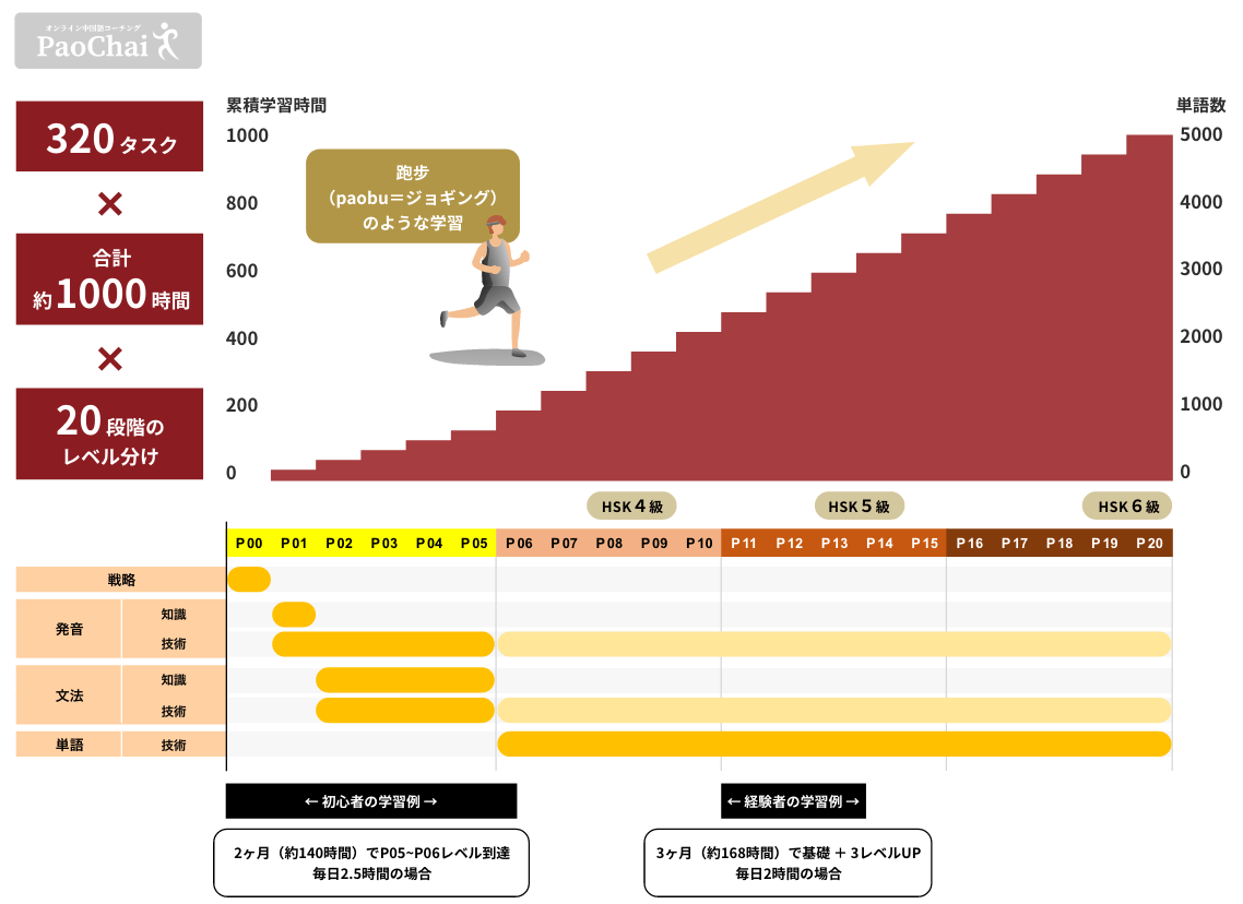 PaoChaiオンライン中国語コーチングとは“会話できる”中国語力を目的に、2ヶ月から6ヶ月の短期で結果を出し、中国語学習力(※1)を身につける全面的な学習サポートサービスです。一人ひとり異なる学習者に合ったSMART目標(※2)を設定、パーソナル学習プランを策定し、1ヶ月に60~90時間という短期集中型の学習で結果を出します。受講期間中は、毎週の専属コーチによるビデオ通話によるコーチングセッション及びレッスンに加え、毎日(1)習得状況のチェック、(2)質問し放題への回答、(3)学習進捗管理の全面的なサポートを提供いたします。