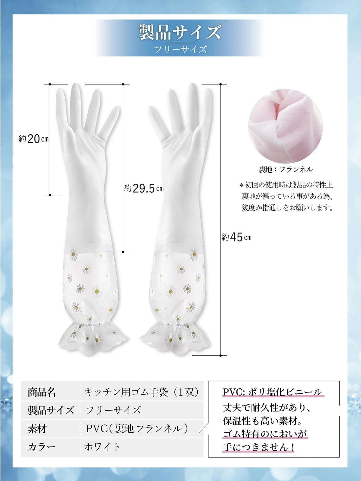 特徴 フランネル裏地/非ラテックス/ホルムアルデヒド検査済/ロング丈/女性向けデザイン