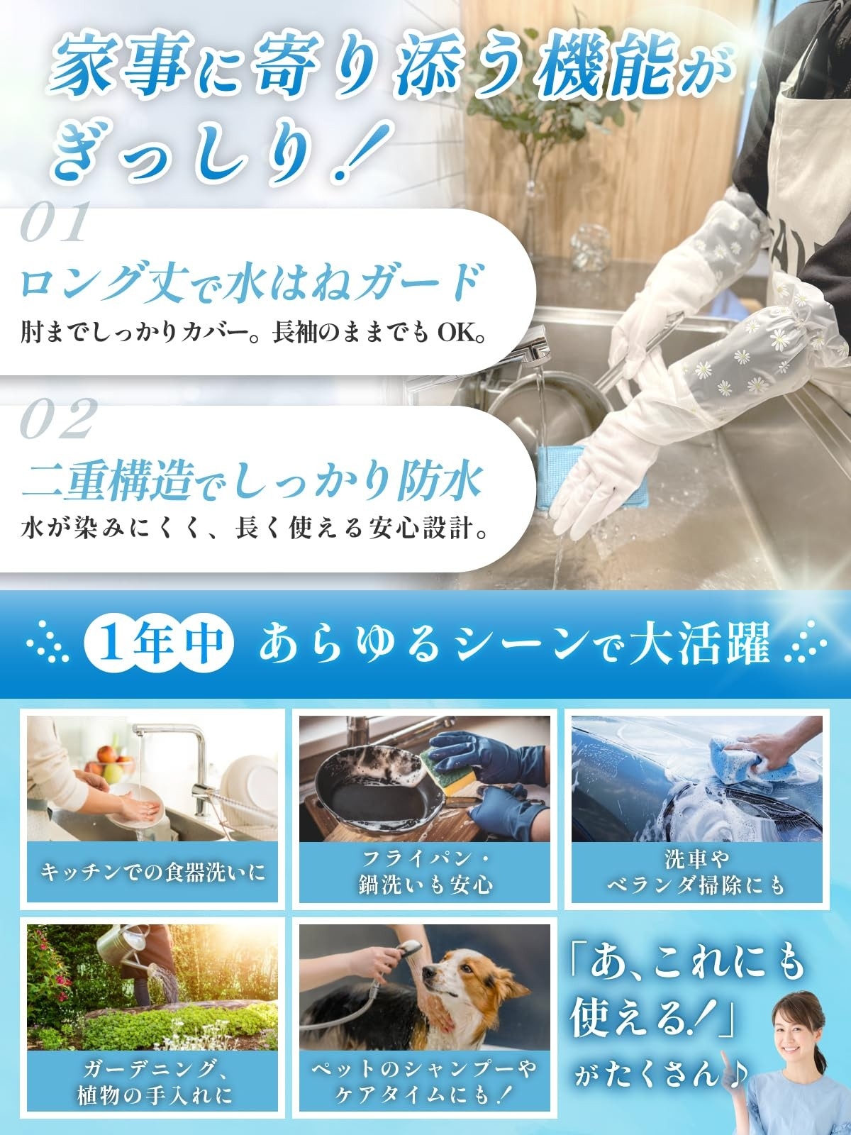 袖口のゴムが水の侵入やズレ落ちを防ぎ、食器洗い・掃除・洗濯など、