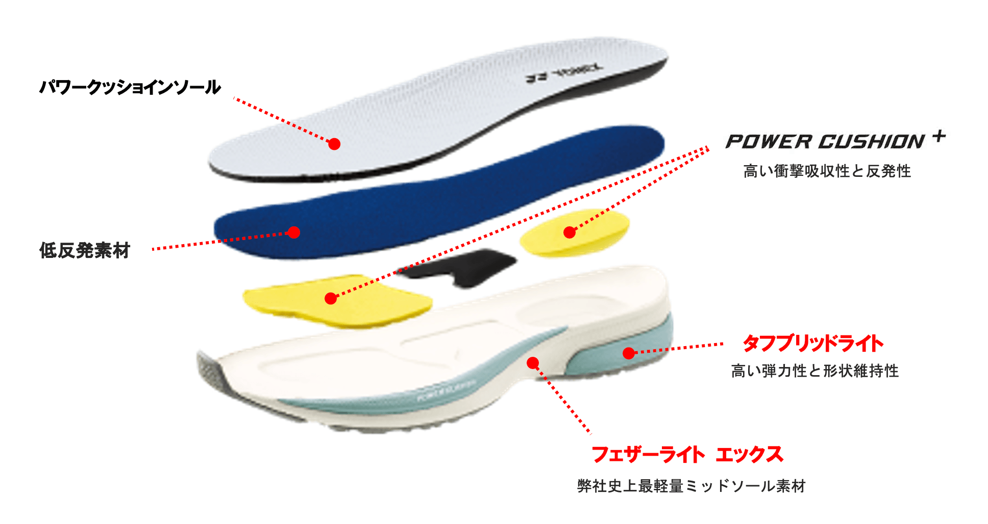 本商品は、ミッドソールの踏みつけ部とかかと部に、12mの高さから落とした生卵が、割れずに6m以上跳ね返る※1弊社独自の衝撃吸収反発素材「パワークッション®プラス」を搭載しており、快適なウォーキングをサポートします。ミッドソール全体にはヨネックス史上最軽量※2素材 「フェザーライト エックス」を弊社ウォーキングシューズに初めて搭載し、軽やかな歩行を支えます。