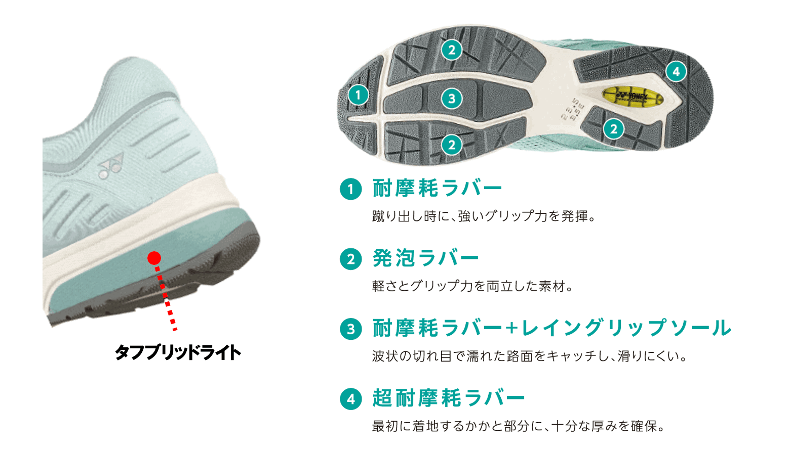 さらに、ウォーキングのかかと着地を考慮して、かかと部から外側の側面にかけて、高い弾力性と形状維持性を併せ持つ「タフブリッドライト」、その下のソールには最適なラバーを各所に配置し、高い耐久性と安定性を両立しました。