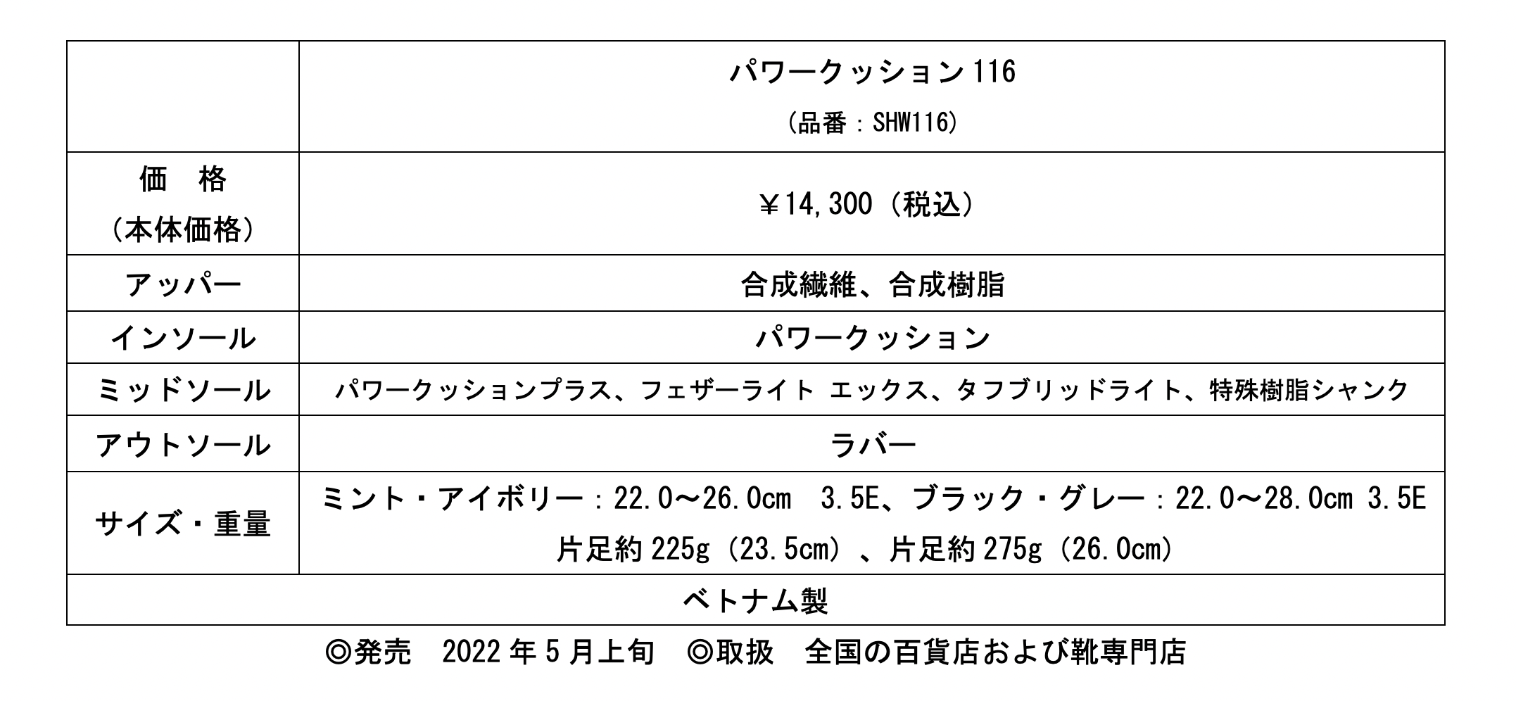 12mの高さから落とした生卵が、割れずに6m以上跳ね返る「パワークッション®プラス」搭載 フィット性とホールド性がアップ 足との一体感が心地いいウォーキングシューズ「パワークッション116」 2022年5月上旬より発売