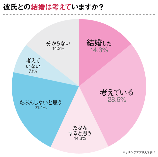 現在もお付き合いを続けていると答えた18.2%の女性に結婚の可能性について聞いてみました。「結婚した」と答えたのは14.3%で、「考えている(28.6%)」「たぶんすると思う(14.3%)」は合わせて42.9%です。「たぶんしないと思う(21.4%)」「考えていない(7.1%)」は合計28.5%なので、現在も交際中の人は結婚に前向きな人が多いことが分かりました。
