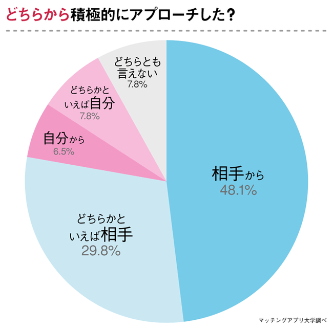 どちらからアプローチをしたか聞いたところ、弁護士男性である「相手から」「どちらかと言えば相手」と回答した人の合計は77.9%で、8割近くを占めました。「自分から」は6.5%と、女性から積極的にアプローチをしてお付き合いに発展したケースは少数でした。「どちらかと言えば自分(7.8%)」を含めても14.3%です。