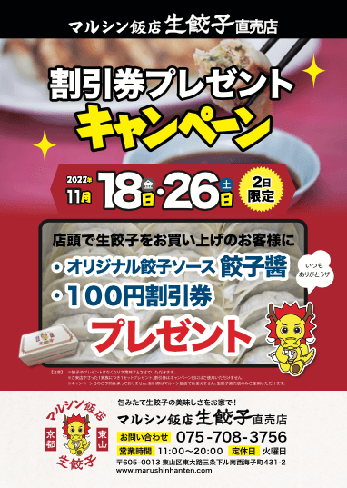 京都東山三条「マルシン飯店生餃子直売店」にて2022年11月18日(金)と26日(土)の2日限定キャンペーンを展開いたします。