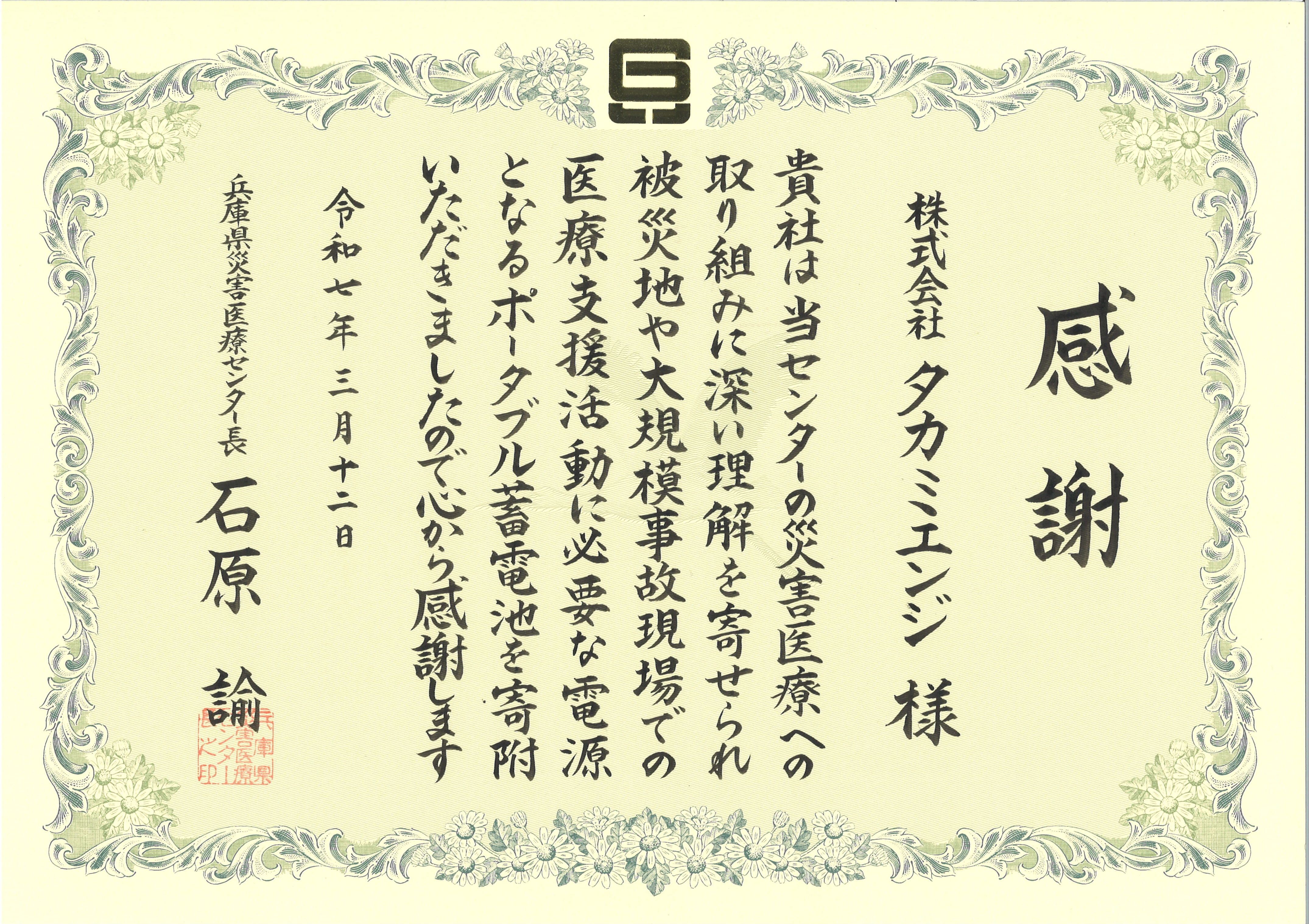 株式会社タカミエンジ(本社:大阪市城東区、代表取締役:室田 正博)は、2025年3月12日に兵庫県災害医療センターへ、ポータブル蓄電池「BCエナジーTE-D3000」を1台寄贈いたしましたことをお知らせいたします。